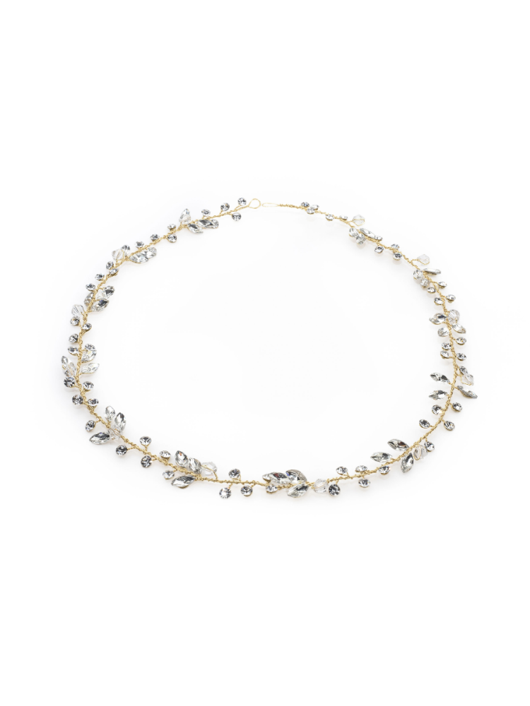 Das von der Tiara inspirierte Gabi Haarband ist mit Kristallen in verschiedenen Formen verziert, die in eine verzweigte Fassung eingebettet sind. Es zieht die Blicke auf sich, wenn Sie vor den Altar treten.