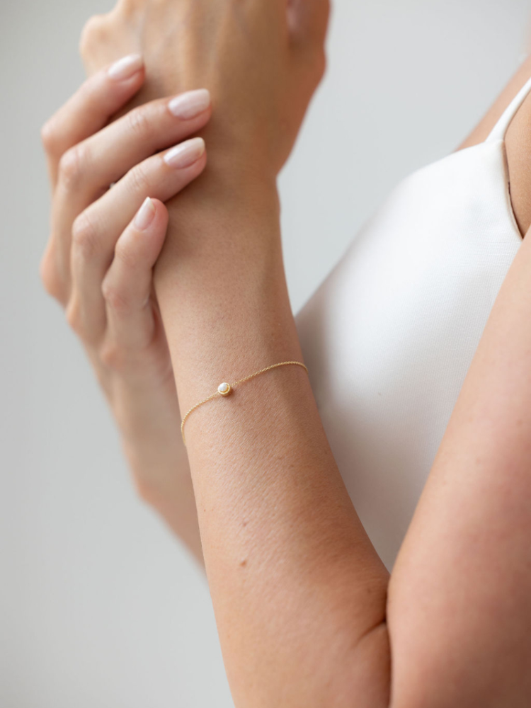 Zartes Armband mit feiner Kette und dezentem Detail in der Mitte für einen weichen, romantischen Look. Mit sicherem Verschluss und Verlängerungskette für eine bequeme Passform. Perfekt für zarte Brautlooks und besondere Anlässe.
