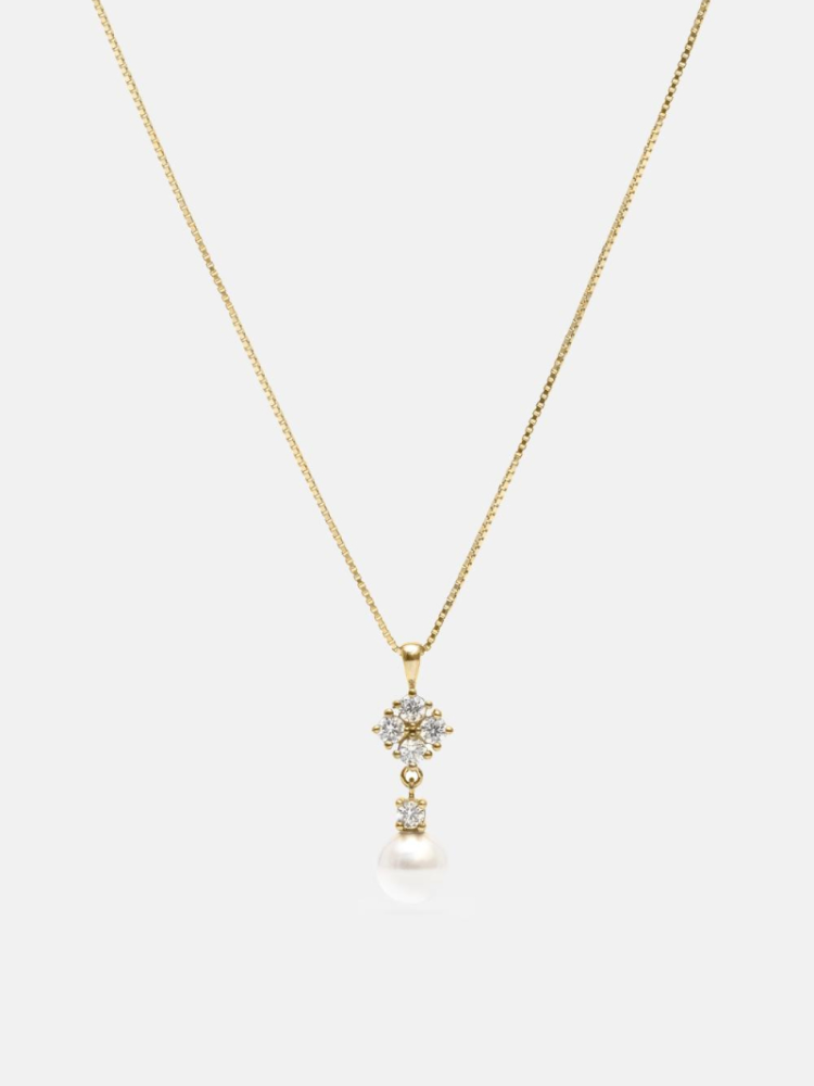 Die Romy Halskette in Gold ist eine feine und elegante Kette mit Kristallen und einer kleinen Perle, die sich sanft mitbewegt. Das blumenförmige Design verleiht der Kette eine klassische und romantische Ausstrahlung. Die Kette ist leicht zu tragen und passt gut zu ruhigen sowie zu ausdrucksstärkeren Kleidern.