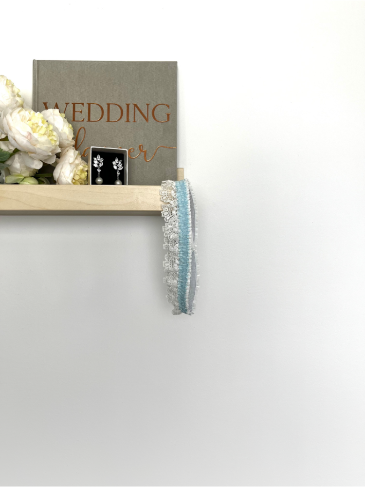 Strumpfband aus zarter Spitze mit einem gerüschten Satinband in Ivory.
