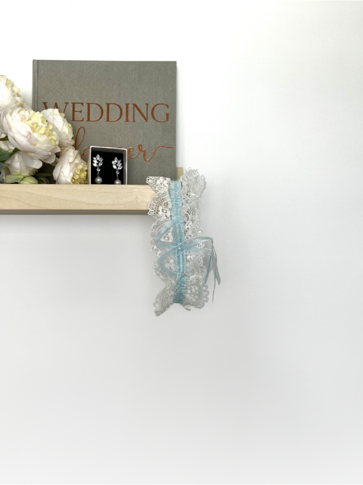 Strumpfband aus zarter Spitze mit einem gerüschten Satinband in Ivory und einem dünnen Band mit einem Swarovski-Kristall.