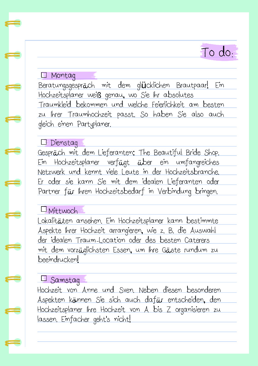 Sie haben vielleicht schon von einem Hochzeitsplaner gehört, aber was genau macht er denn? Einfach ausgedrückt ist ein Hochzeitsplaner jemand, der alles rund um Ihre Hochzeit organisiert! Jetzt fragen Sie sich vielleicht, wozu Sie einen Hochzeitsplaner brauchen. Nun, eine Hochzeit zu planen ist nicht immer so einfach! Um sich ein Bild von den Aufgaben eines Hochzeitsplaners zu machen, geben wir Ihnen einen Einblick in den Terminkalender eines Hochzeitsplaners!