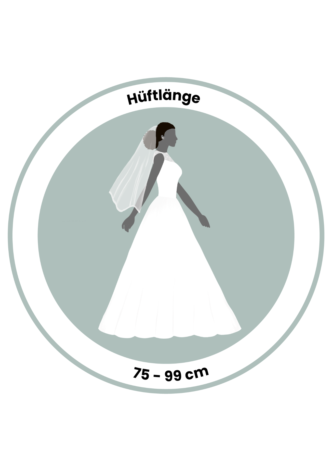 Hüftlange: Ein hüftlanger Schleier ist perfekt, wenn du etwas mehr Länge wünschst, aber trotzdem unbeschwert tanzen möchtest. Der Schleier endet auf Hüfthöhe und betont so die Silhouette deines Kleides – besonders schön bei Meerjungfrauenkleidern. |