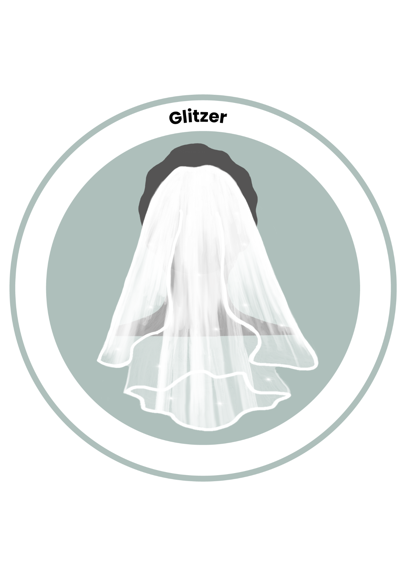 Glitzer: Ein Glitzerschleier ist genau das Richtige für Bräute, die auf ihrer Hochzeit glänzen möchten. Die schimmernden Partikel reflektieren das Licht wunderschön – ob im Sonnenschein oder im Scheinwerferlicht der Feier. Ideal für einen magischen Brautlook, der garantiert alle Blicke auf sich zieht. |