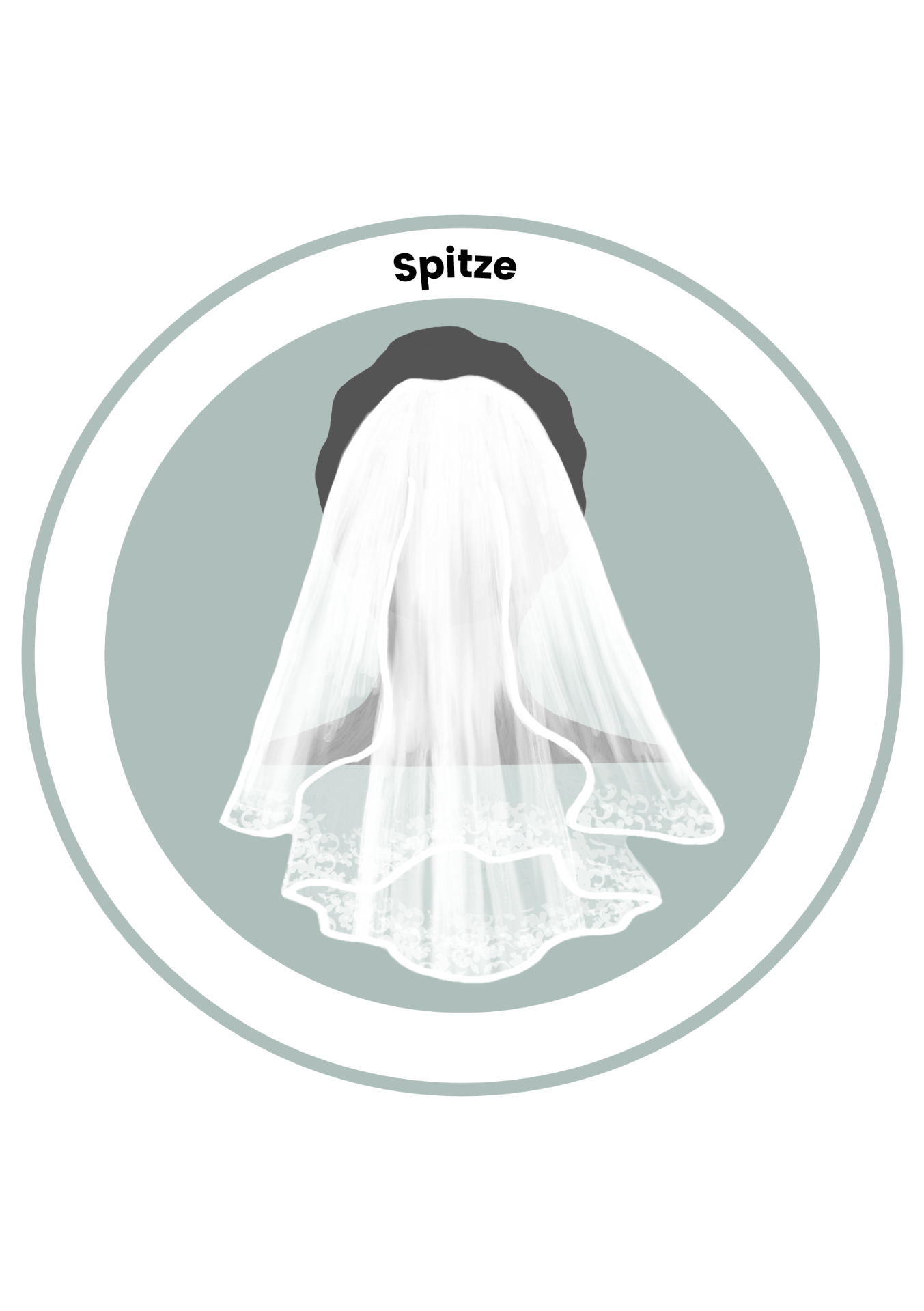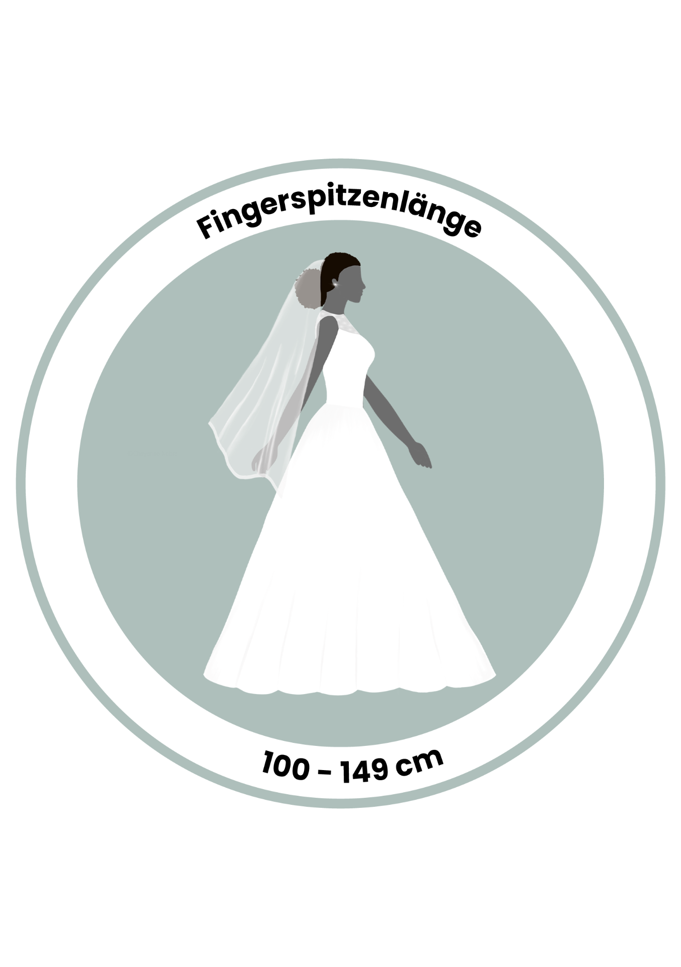 Fingerspitzenlänge: Dieser Schleier reicht – wie der Name schon sagt – bis zu deinen Fingerspitzen. Er verleiht deinem Look eine elegante Note, ohne das Kleid komplett zu verdecken. Die Länge lässt ihn hinter dir mitschweben, während Details an Kleid oder Schleppe weiterhin sichtbar bleiben. Er passt zu nahezu jedem Brautkleid – nicht umsonst einer der Favoriten vieler Bräute. |