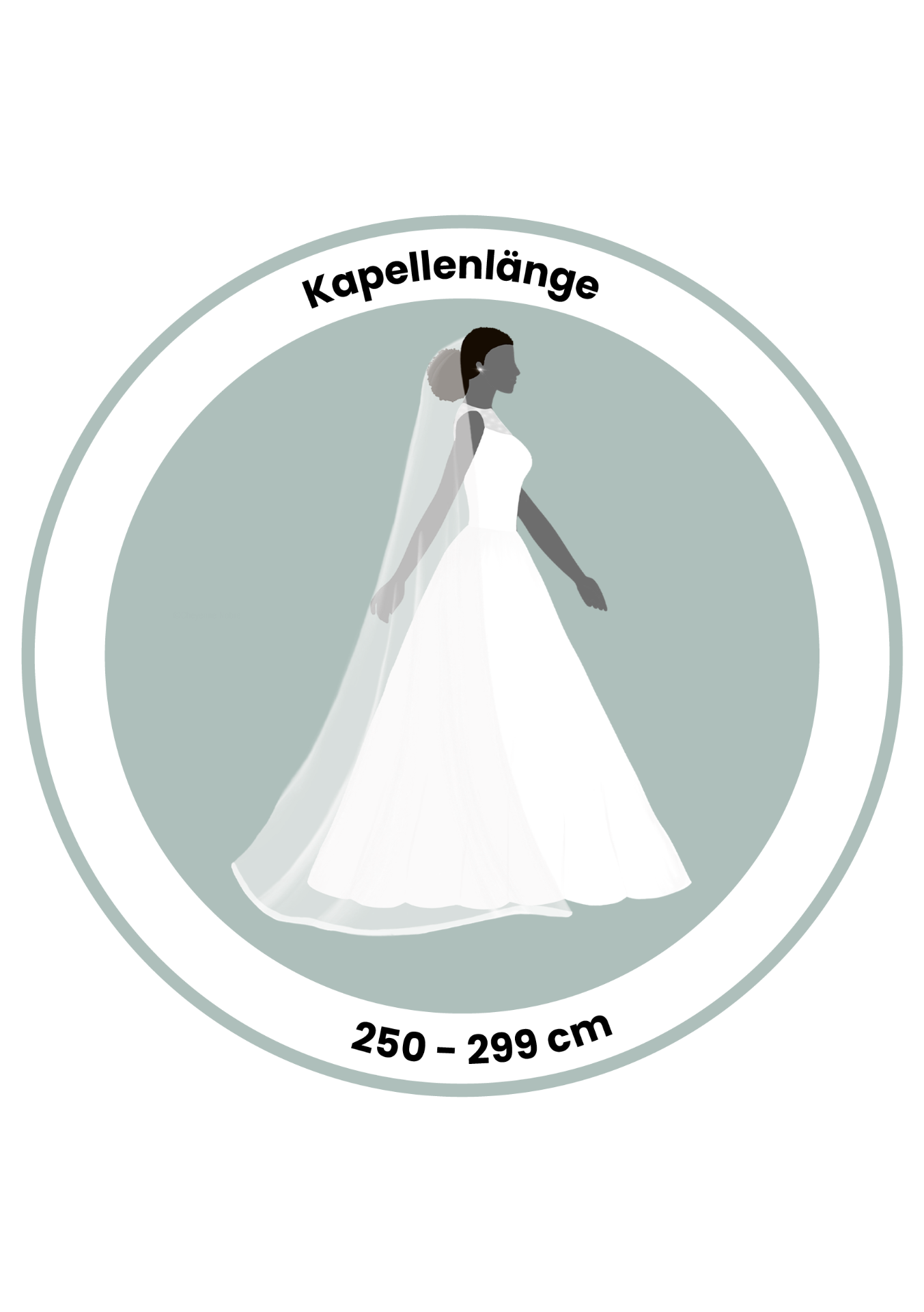 Kapellenlänge: Unsere zweitlängste Schleier-Variante. Mit mindestens 250 cm sorgt dieser Schleier für einen dramatischen Effekt. Etwas leichter als ein Kathedralschleier – ideal für intime Locations. Besonders schön bei Kleidern mit Schleppe, z. B. A-Linie, Prinzessin oder Meerjungfrau. Je nach Stil lässt sich der Look schlicht oder detailreich gestalten. |