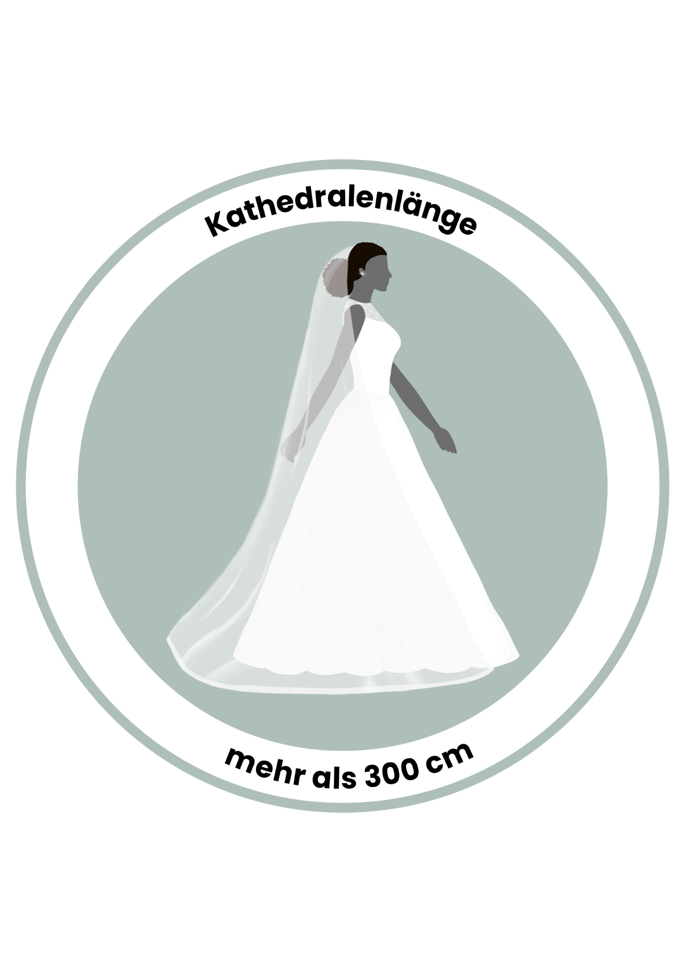 Kathedralenlänge: Du möchtest einen großen Auftritt? Dann ist dies die richtige Schleierlänge für dich. Unsere Kathedralschleier sind mindestens 3 Meter lang und entfalten ihre volle Wirkung in großen Räumen wie Kirchen oder eleganten Hochzeitssälen. Sie verlängern die Schleppe deines Kleides auf märchenhafte Weise – perfekt für eine traumhafte Hochzeit. |