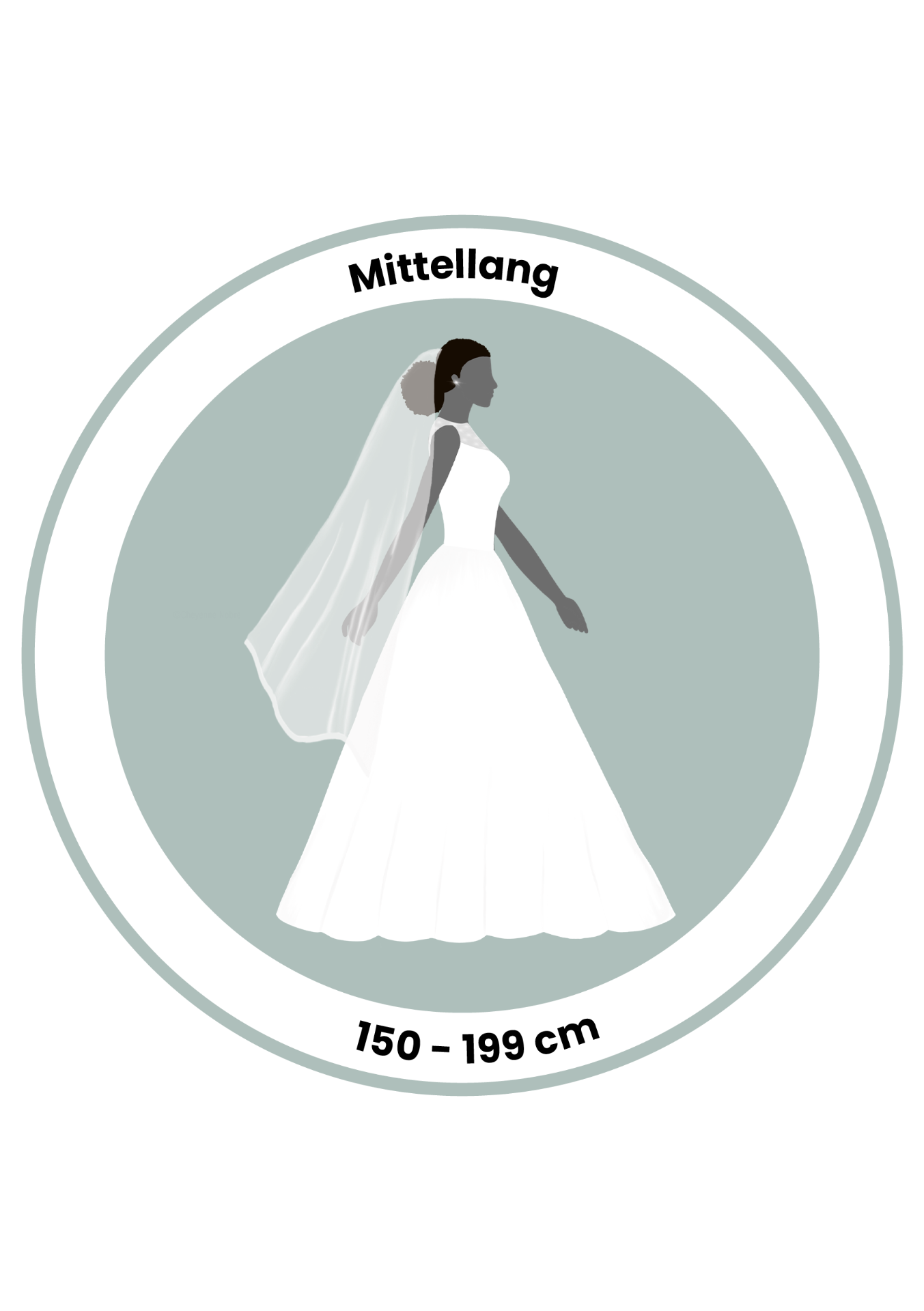 Mittellang: Ein mittellanger Schleier wirkt etwas dramatischer als ein Fingerschleier, ohne deine Bewegungsfreiheit einzuschränken. Je nach Körpergröße reicht er fast bis zum Boden – praktisch und dennoch elegant. Ideal für Hochzeiten drinnen wie draußen. |