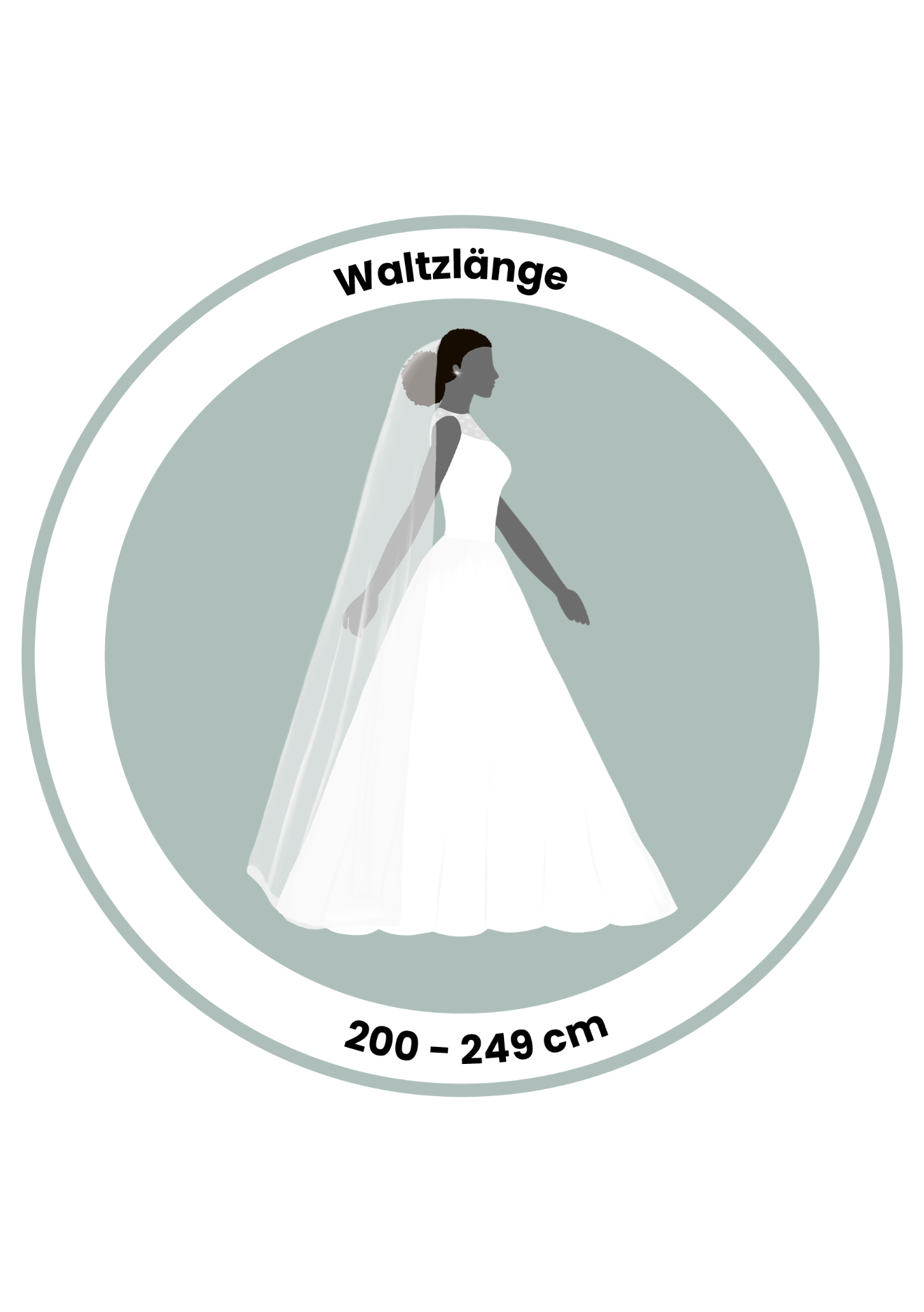 Waltzlänge: Ein Schleier in Waltzlänge verleiht dir einen royalen Look – ohne das Gewicht einer langen Schleppe. Er berührt leicht den Boden, zieht sich aber nicht weit hinter dir her. Dadurch ist er weniger unhandlich und kann sogar beim ersten Tanz getragen werden. Elegant, praktisch und ausgewogen. |