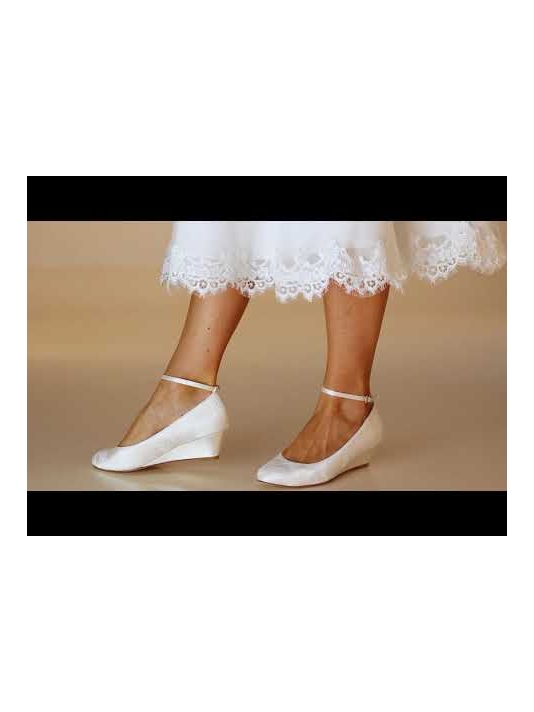 Bei diesem Brautschuh handelt es sich um einen wunderschönen Klassiker. Der Brautschuh ist sehr modern mit seinem Keilabsatz. Iris ist sehr angenehm zu tragen, trotzdem wirkt er am Fuß zierlich und elegant.