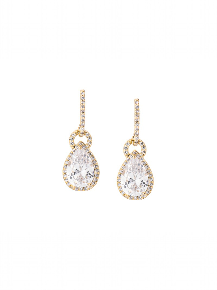 Elevate your bridal style with these sophisticated earrings from the G.Westerleigh collection. Crafted with a radiant gold-plated base, the drop-shaped design showcases a brilliant Cubic Zirconia centerpiece surrounded by smaller crystals that sparkle from every angle. The elegant shape and refined brilliance make these earrings a perfect choice for brides who want a glamorous yet timeless look.