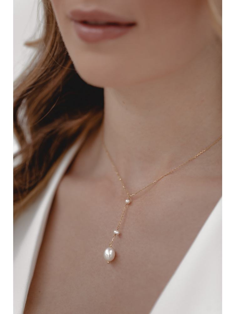 Himmlisch elegant und modern zugleich: zartes Collier mit zwei kleinen und einer größeren Süßwasserperle - die schmal zulaufende Form des Colliers passt besonders gut zu Brautkleidern mit V-Ausschnitt.