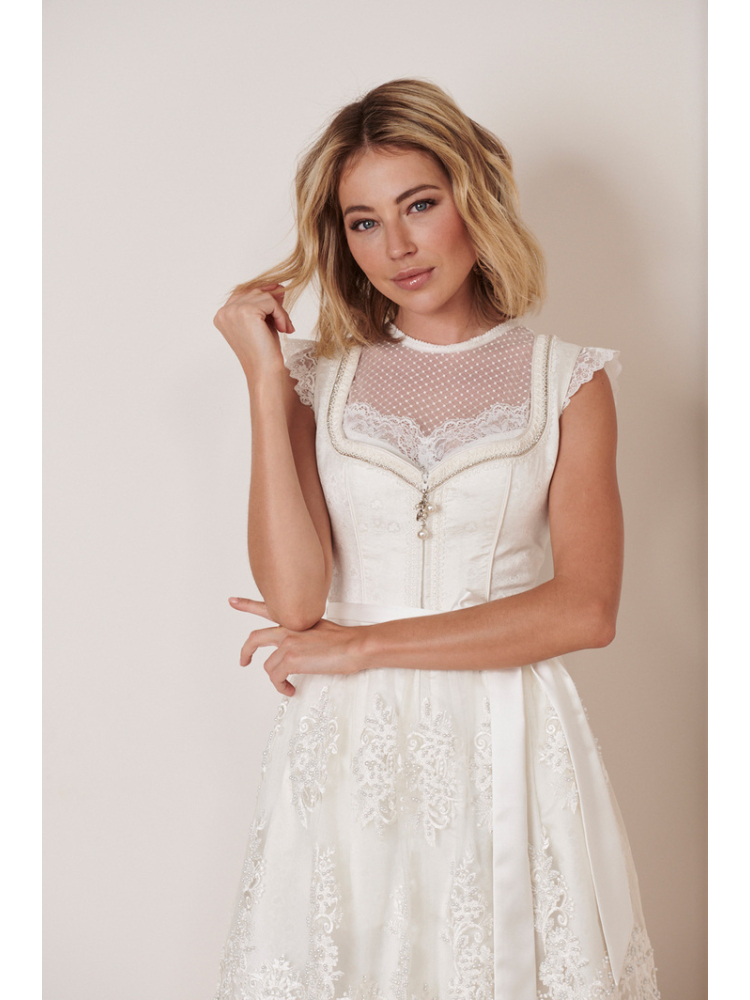 Das wunderschöne hochzeitsdirndl Liliane ist eine perfekte Wahl für diejenigen, die schlichte Eleganz und subtile Verzierungen schätzen. Das schlichte Dirndlkleid in Ivory wird durch eine atemberaubende Spitzenschürze aufgewertet, die aufwendig mit funkelnden Perlen besetzt wurde. Der Reißverschlussanhänger mit einem funkelnden Stein vervollständigt das Gesamtbild und rundet das Outfit perfekt ab. Das Liliane Dirndl ist perfekt geeignet für Hochzeiten und andere feierliche Anlässe wie das Oktoberfest.