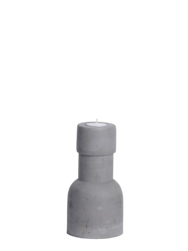 Aus glattem Zement gefertigt, nimmt er ein Teelicht oder eine schlanke Stabkerze auf und zeigt eine zurückhaltende Silhouette, die Verbundenheit und beständige Wärme ausstrahlt.