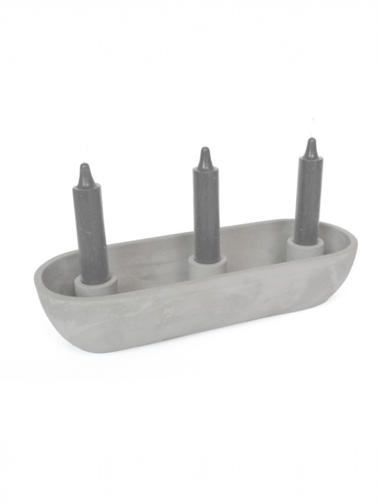 Handgegossen aus feinem Beton in zartem Grau misst die Carice 27 x 10 x 6 cm und nimmt drei schlanke Stabkerzen auf. Die stabile, architektonische Silhouette wirkt zurückhaltend und zugleich ausdrucksvoll; eine kleinere Einzelkerzen-Version steht für intimere Arrangements zur Verfügung.