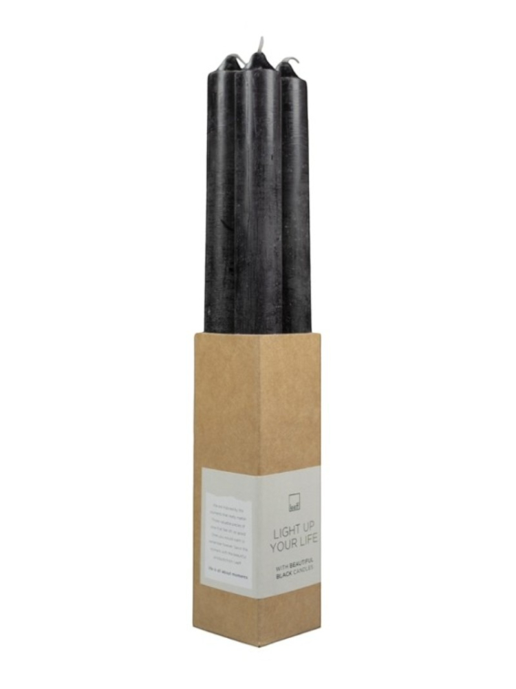 Aus reinem Wachs und in einem tiefen Schwarzton gefertigt, misst jede Kerze 25 x 2 cm und sorgt mit etwa 10 Stunden warmem Schein für langanhaltende Stimmung. Das Vierer-Set kommt in einer ansprechenden Verpackung, die mit der Aufschrift "Light up your life with beautiful black candles" versehen ist – ideal für Kerzenleuchter oder zierliche Kerzenhalter.
