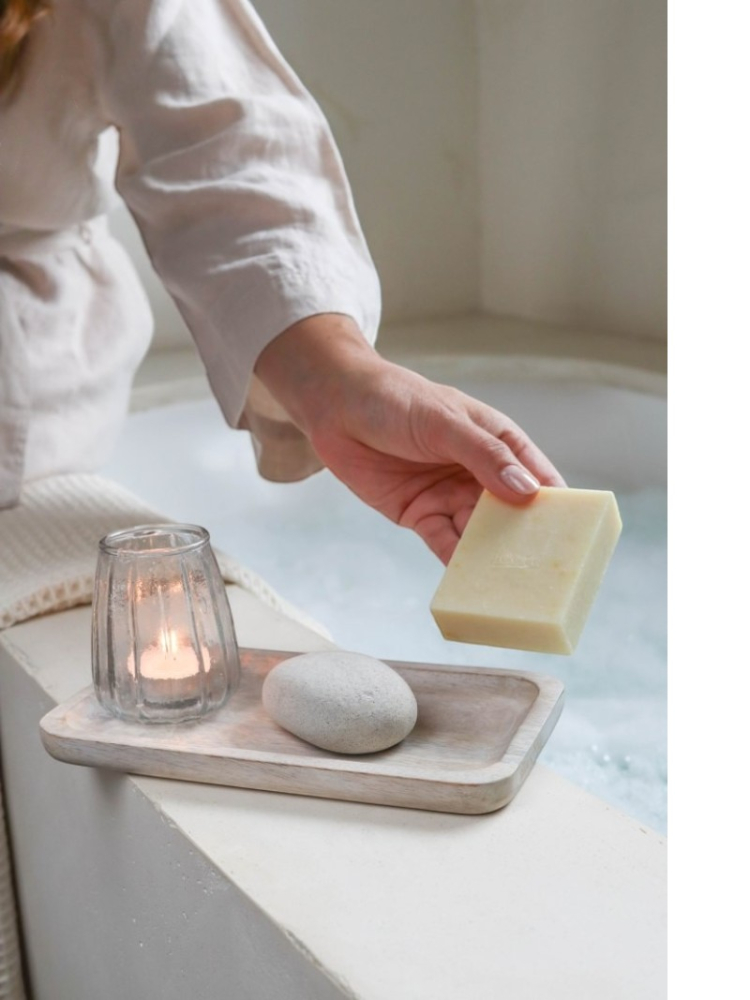 Anwendung: Das Steinpeeling auf nasser Haut in kreisenden Bewegungen über rauere Stellen führen, nicht zu fest. Seife mit Wasser aufschäumen, auf nasser Haut verteilen und gründlich abspülen. Augenpartie aussparen.