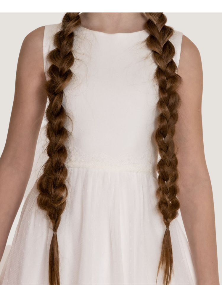 Das Kommunionkleid "Sonne" von Miolilou besticht durch Eleganz und Leichtigkeit. Ein glattes Viskose-Oberteil sorgt für Komfort, während der zarte Pünktchentüll-Rock eine verspielte Note verleiht. Die spanische Spitze an der Taille und die große Schleife auf der Rückseite unterstreichen den romantischen Stil. Perfekt für die feierliche Kommunion.