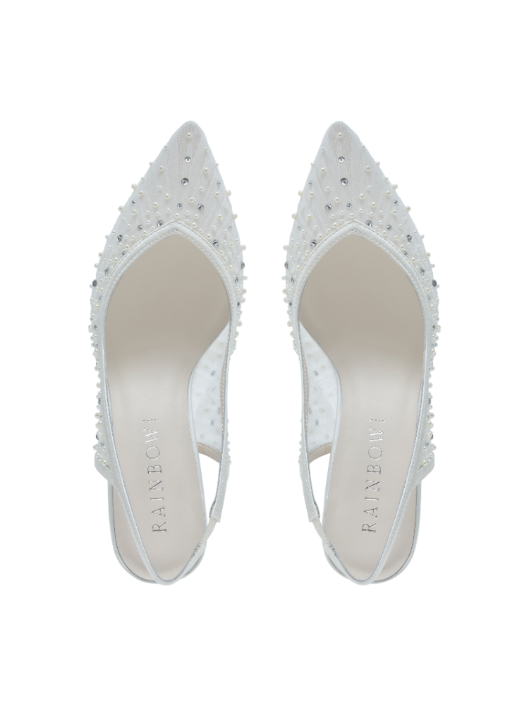 Die Rainbow Club Lucia Slingback Brautschuhe verbinden romantisches Funkeln mit eleganter Leichtigkeit. Der zarte Ivory-Tüll ist mit schimmernden Kristallverzierungen veredelt. Dazu kommen eine spitze Form, ein luftiges Slingback-Design und ein stützender 7 cm Blockabsatz.