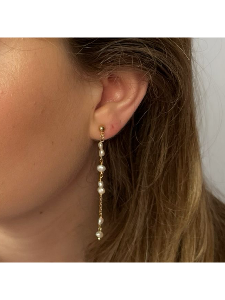 | Pflegehinweise | Stylish gold-plated earrings over brass, delicately finished with sparkling freshwater pearls. These long Mila earrings exude elegance and are perfect for special occasions or as a subtle statement piece. Also available in silver. |